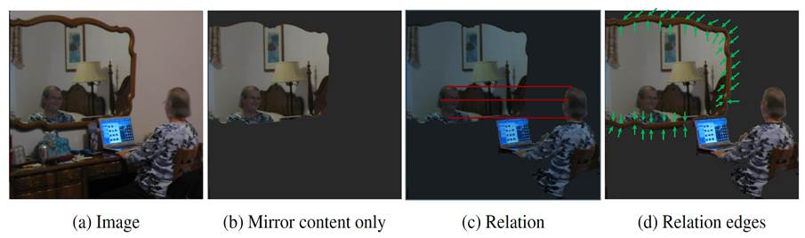 Abstract. The mirror detection problem is important as mirrors can affect the performances of many vision tasks. It is a difficult problemsince it requires an understanding of global scene semantics. Recently, a method was proposed to detect mirrors by learning multi-level contextual contrasts between inside and outside of mirrors, which helps locate mirror edges implicitly. We observe that the content of a mirror reflects the content of its surrounding, separated by the edge of the mirror. Hence, we propose a model in this paper to progressively learn the content similarity between the inside and outside of the mirror while explicitly detecting the mirror edges. Our work has two main contributions. First, we propose a new relational contextual contrasted local (RCCL) module to extract and compare the mirror features with its corresponding context features, and an edge detection and fusion (EDF) module to learn the features of mirror edges in complex scenes via explicit supervision. Second, we construct a challenging benchmark dataset of 6,461 mirror images. Unlike the existing MSD dataset, which has limited diversity, our dataset covers a variety of scenes and is much larger in scale. Experimental results show that our model outperforms relevant state-of-the-art methods.